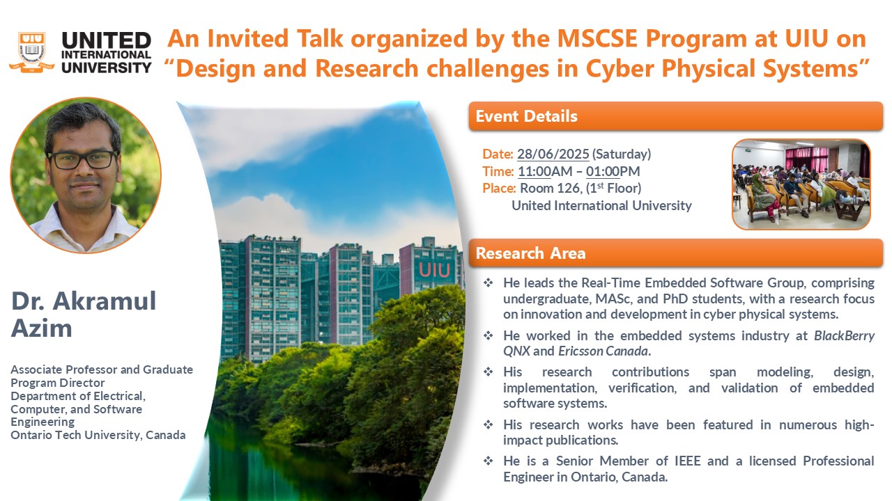 MSCSE program office is organizing an invited talk on ‘Design and Research Challenges in Cyber Physical Systems’. This event is open to anyone who wishes to join. Dr. Akramul Azim will be sharing his experience and engage in conversation with the attendees.